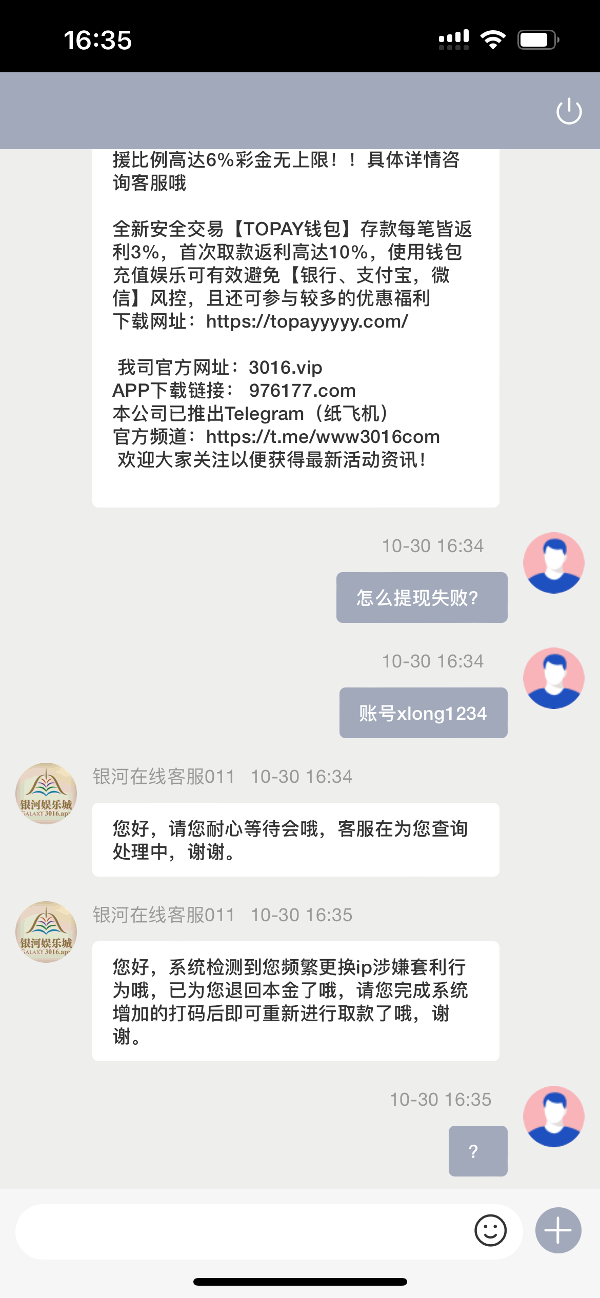 真的第一次在黑黑推荐的平台被黑了,银河国际。没有申请任何优惠 也没有多账号 一直说我多ip