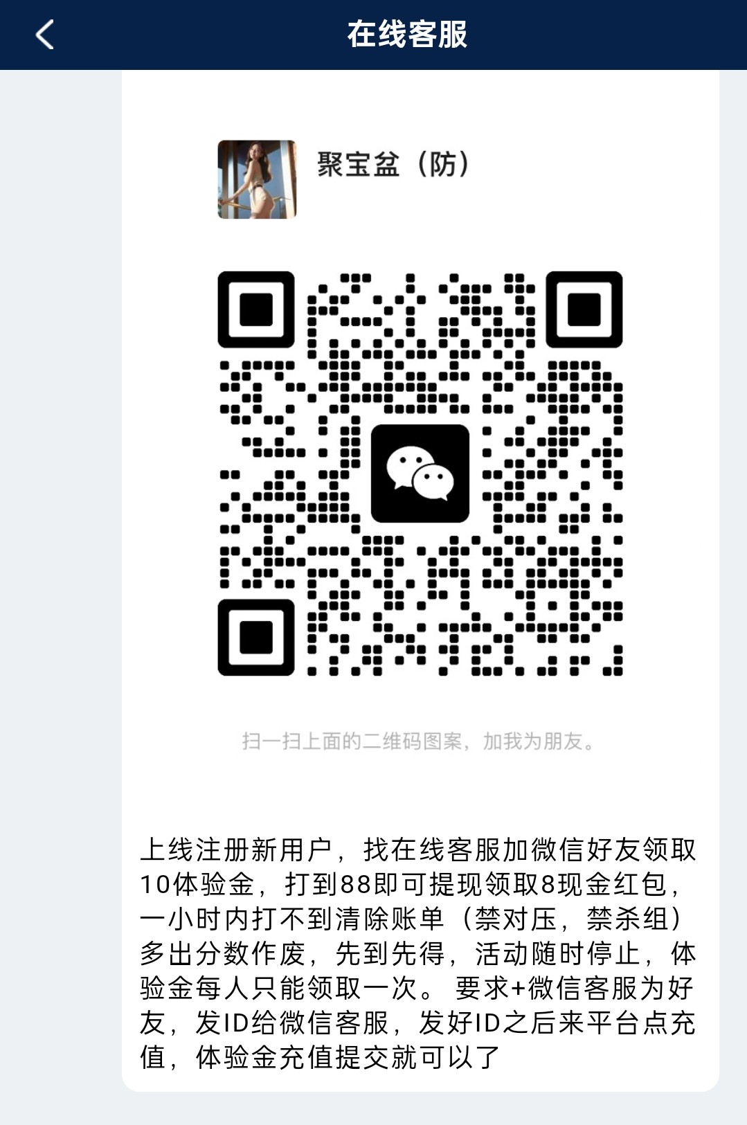 微信扫码注册登录联系客服领取10体验金,娱乐到88下8