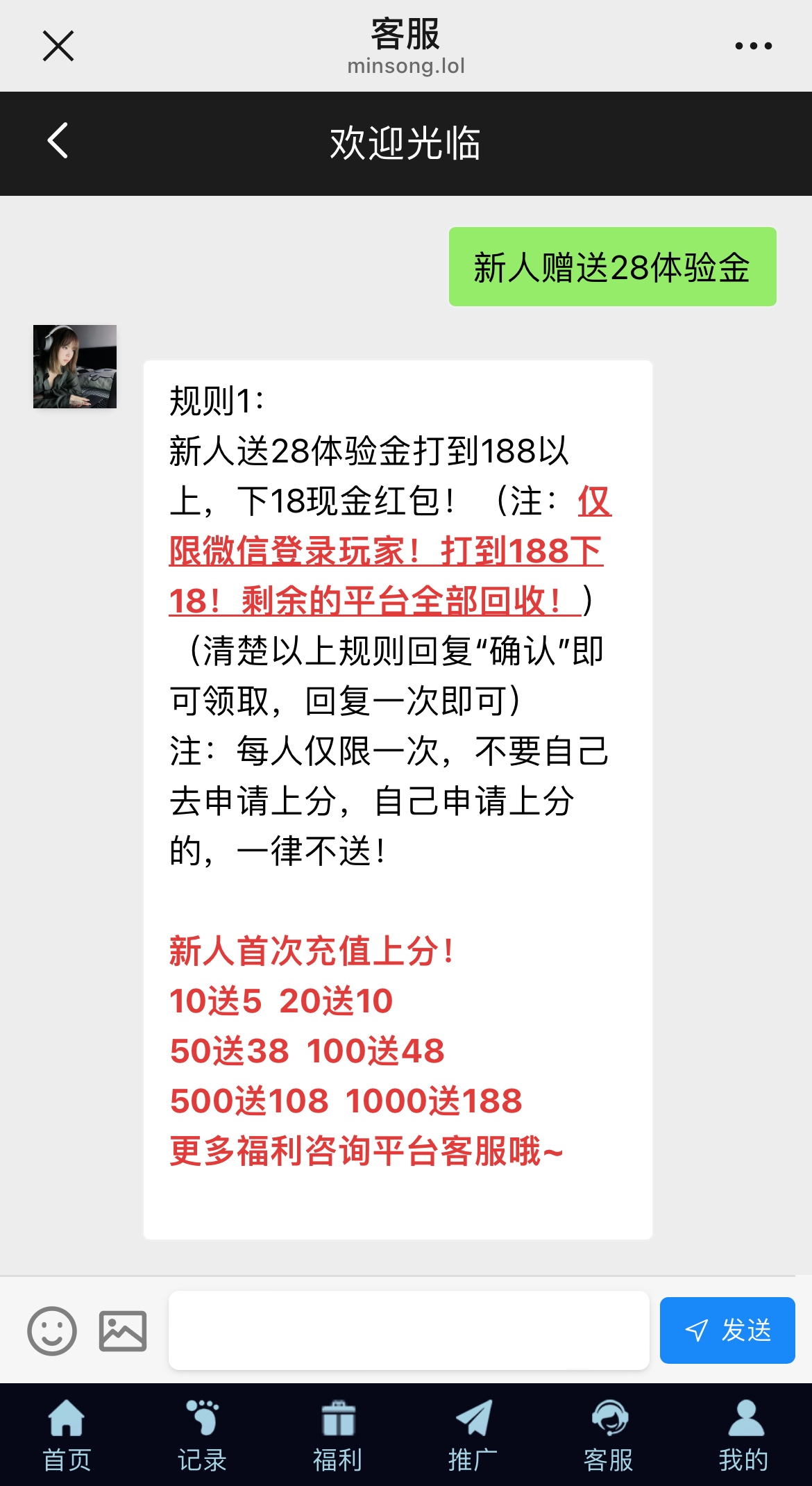 微信扫码登入进去点客服有个新人赠送28体验金点一下然后回复确认就行了,打到188下18现金