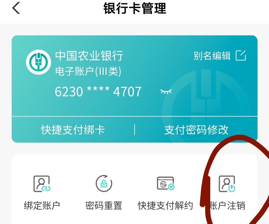 8:使用完红包你就可以注销了 注销流程:打开农业银行APP 点击我的银行卡 点击需要注销的电子卡(余额为0才能注销)!点击注销即可!秒注销
