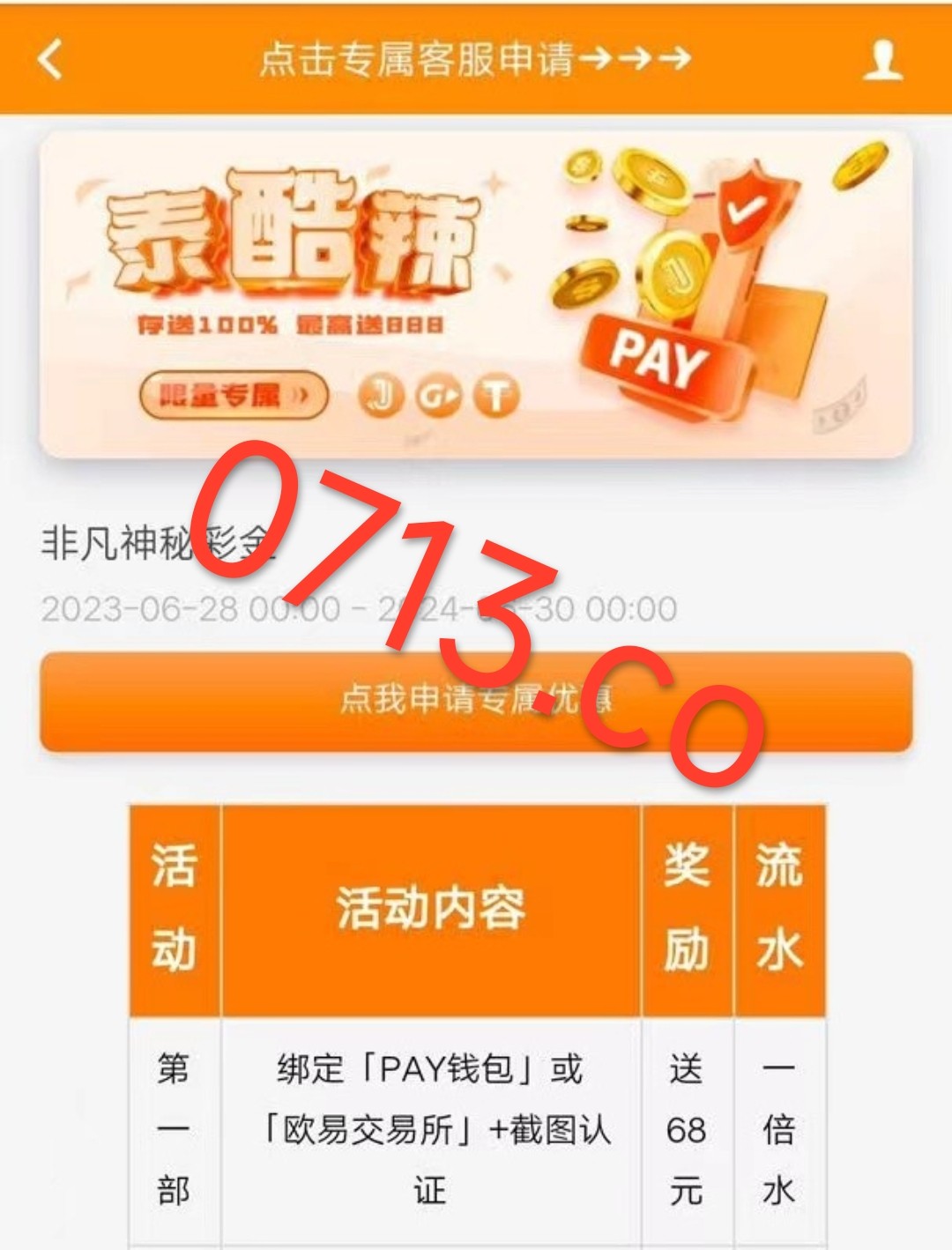 有账号存款过的登录进去主页有“泰裤辣”活动页面就是可以参加,如果没有这个页面就是不能参加了,绑定任何数字钱包提币链接送68,送的68赢了 提虚拟币再领38 (没号的就不用去了