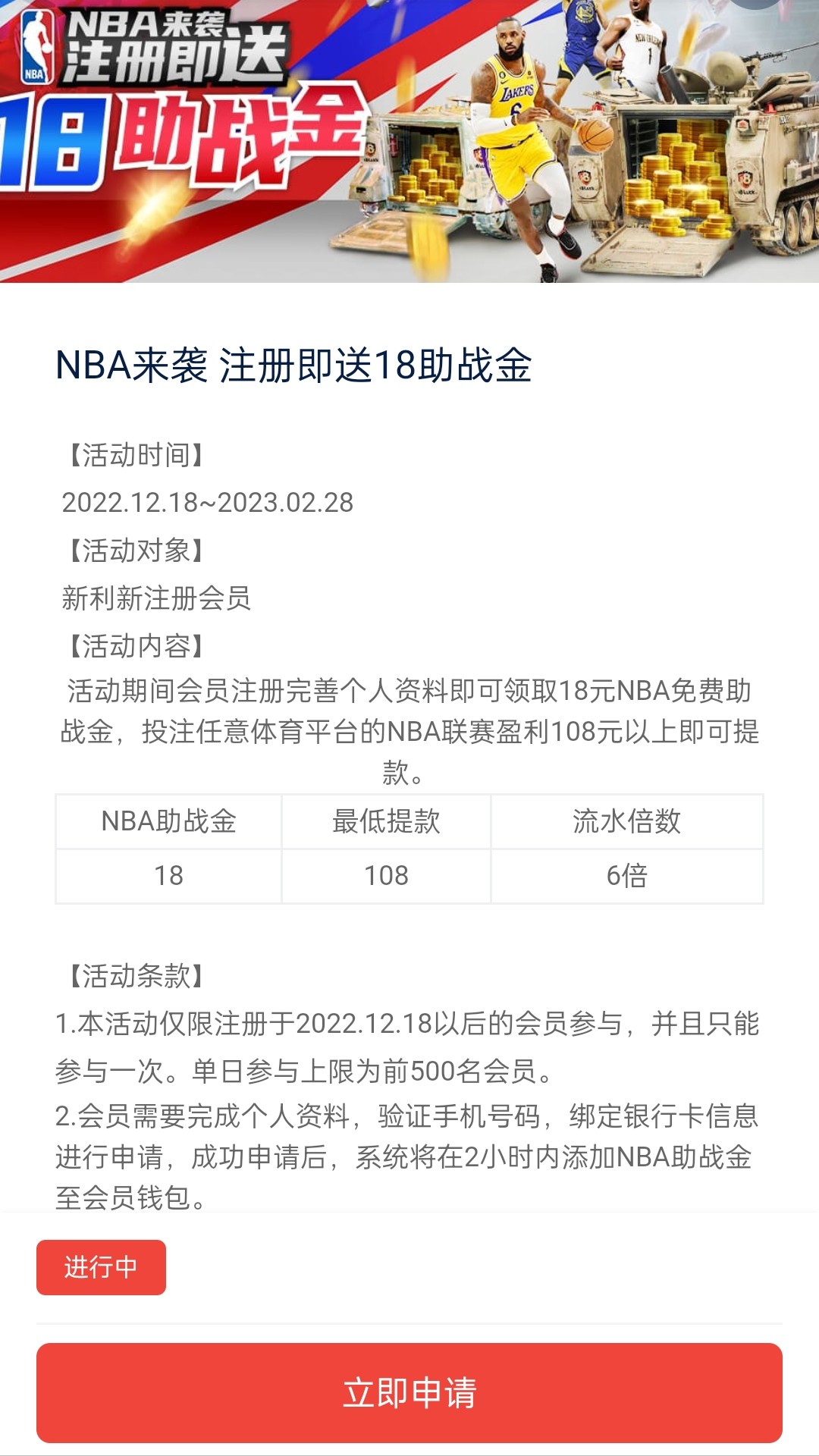 2022.12.18前注册的老用户自助申请18彩金,只能投注NBA赛事,满100提