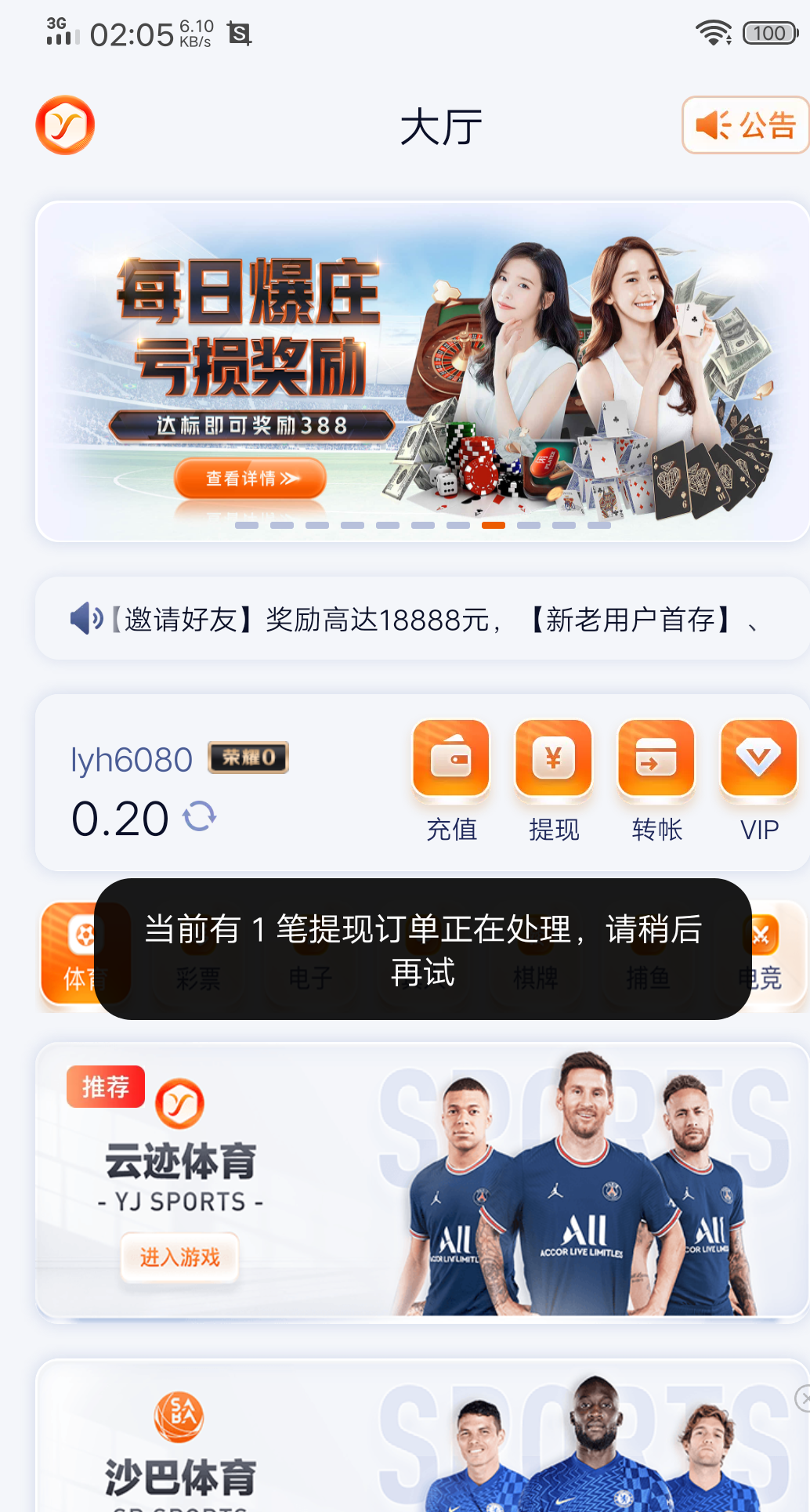 充一百提300不到账 一直在处理 让我一直等 一天了