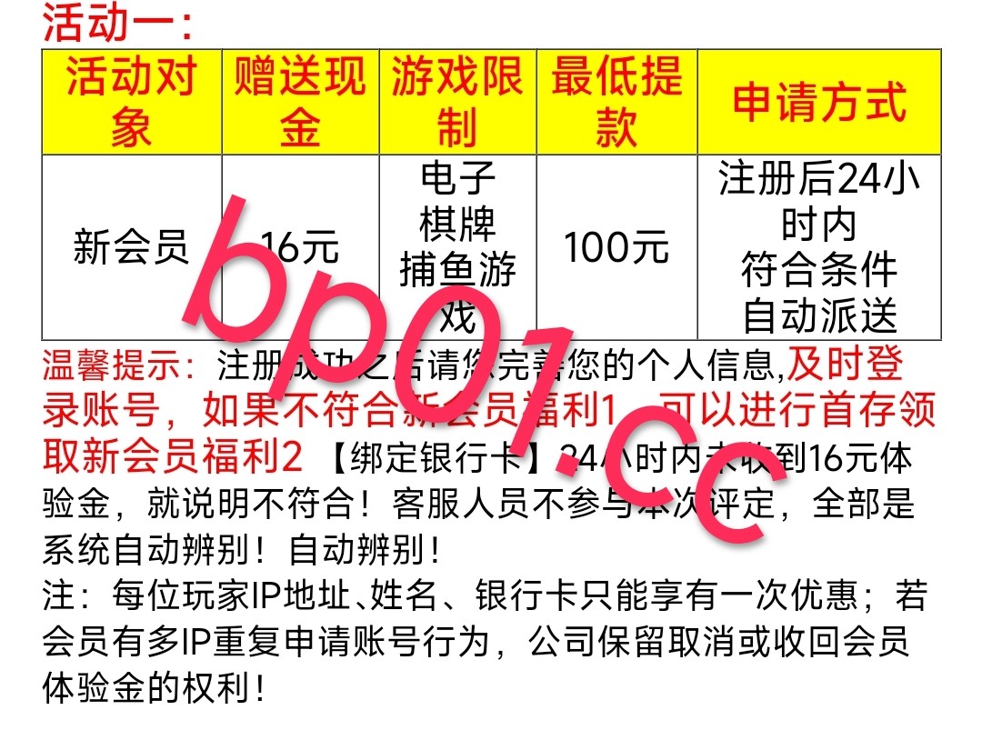 新用户注册绑卡24小时以后自动赠送16元彩金 限制游玩电子捕鱼棋牌 最低提款100元