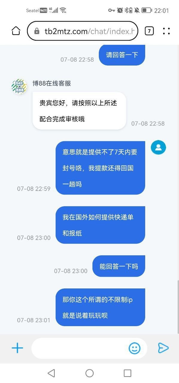 提款的时候说需要我提供报纸快递单我玩之前问他们在东南亚国家能不能玩又说能玩,充值的时候什么都说得好,能玩,不限制,提款的时候,要你提供快递和报纸一些国内才有的东西,问就是不能提供7天内就封号,再问就是请按照要求提供,提供不了就直接7天内封号,根本不回答提供国外没有快递单号和报纸的事情,明摆着就是黑你钱,人在国外的千万不要玩,国内的也想想清楚在玩博88,人家几千都黑你别心存侥幸,黑到你了就是无理由黑