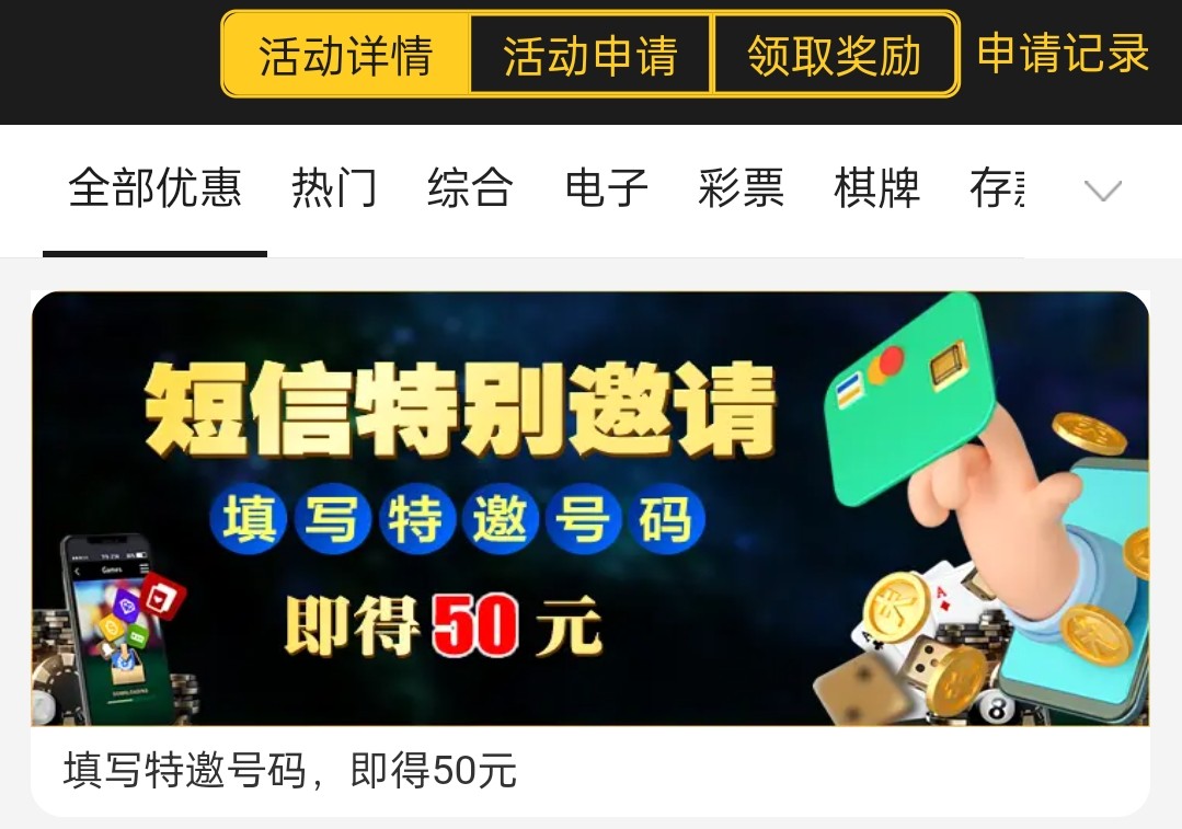 之前发过 特邀重置了新用户注册绑卡 完善信息 到优惠里面找到特邀送50彩金活动 输入手机号是特邀的话秒到