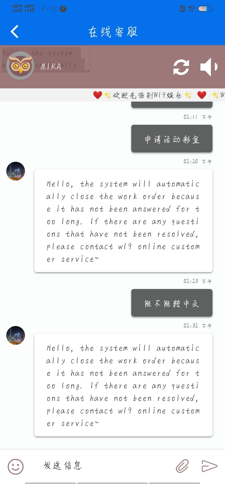 系统自动回复的,时间到了 老板感谢你的上分。 大概就这意思。
