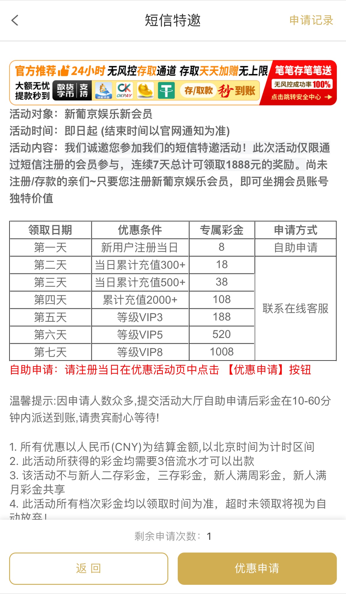 注册完善资料,优惠里申请,彩金3倍流水,具体自行查看
