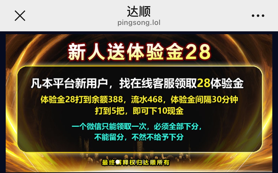 体验金28打到余额388,流水468,体验价间隔30分钟,打到5把,即可下10现金.剩余分数作废!