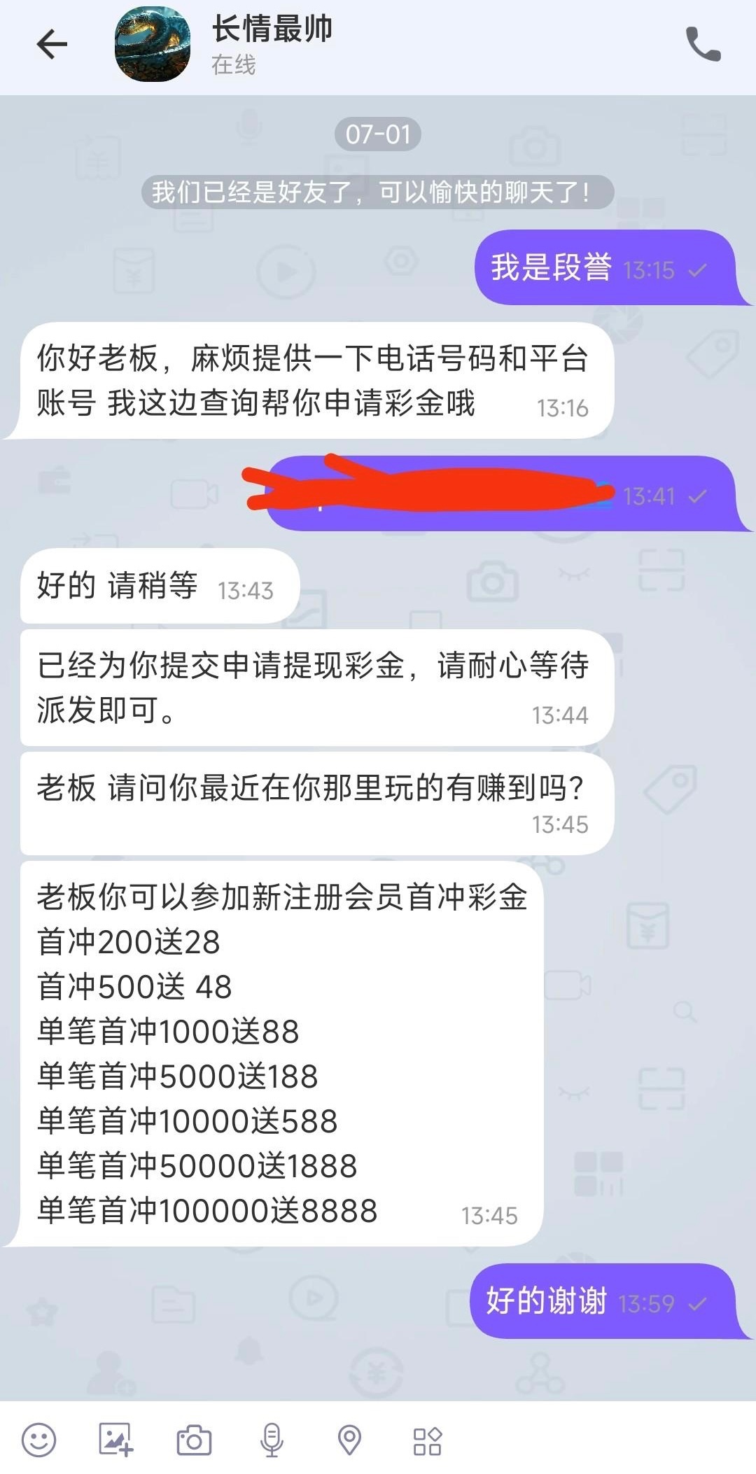 有漏接电话的兄弟可以去碰瓷看看,在名单才送,添加线聊客服:aa6789 申请彩金