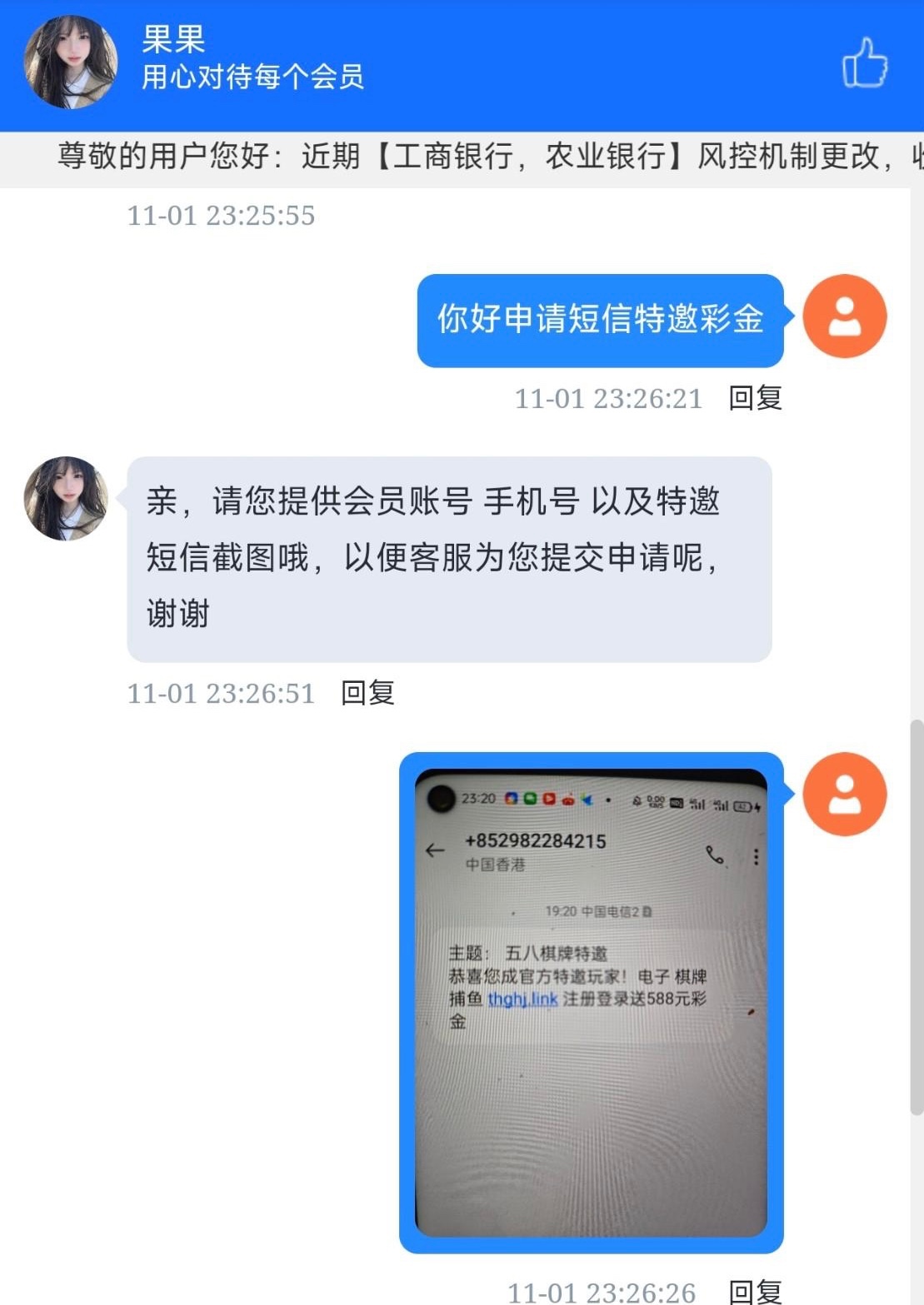 碰瓷短信特邀,送的彩金只能玩棋牌和捕鱼会制作短信内容的可以去试试