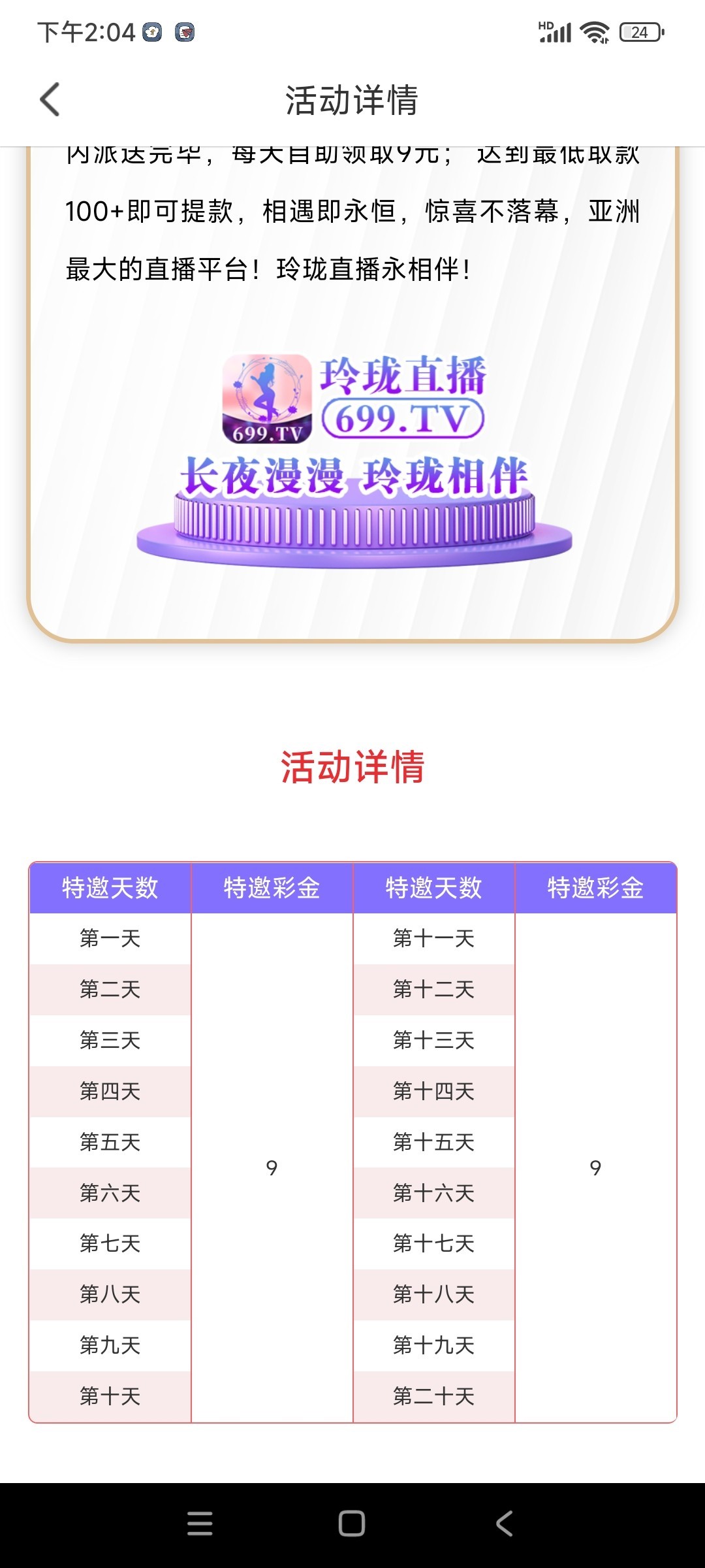 玲珑直播送180,每天送9,连送20天