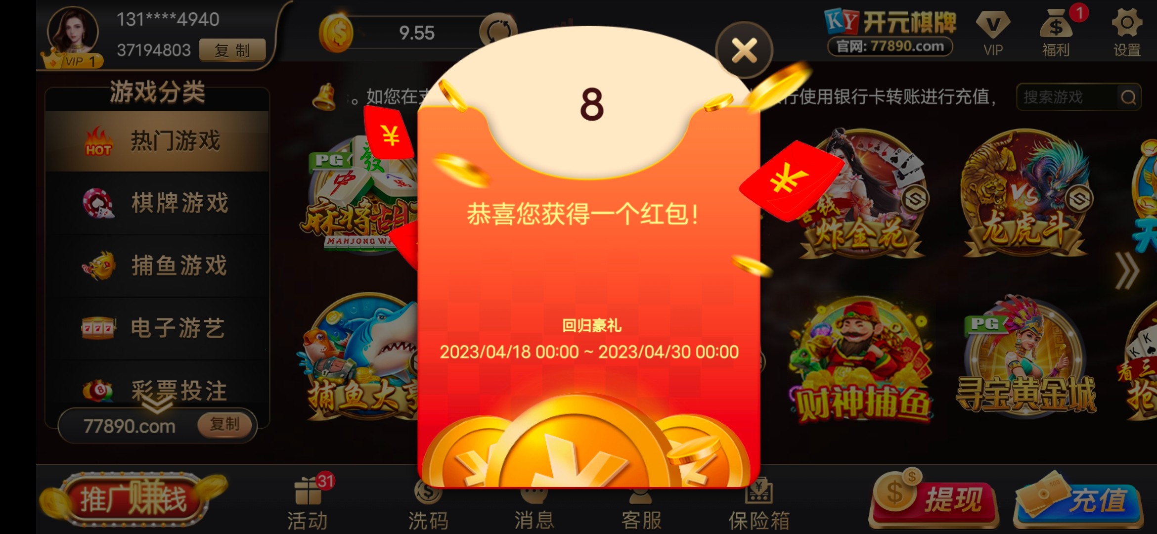 今天下午给我打的  0.2麻将直接爆快300倍  后面去玩黄金城提现200直接到账