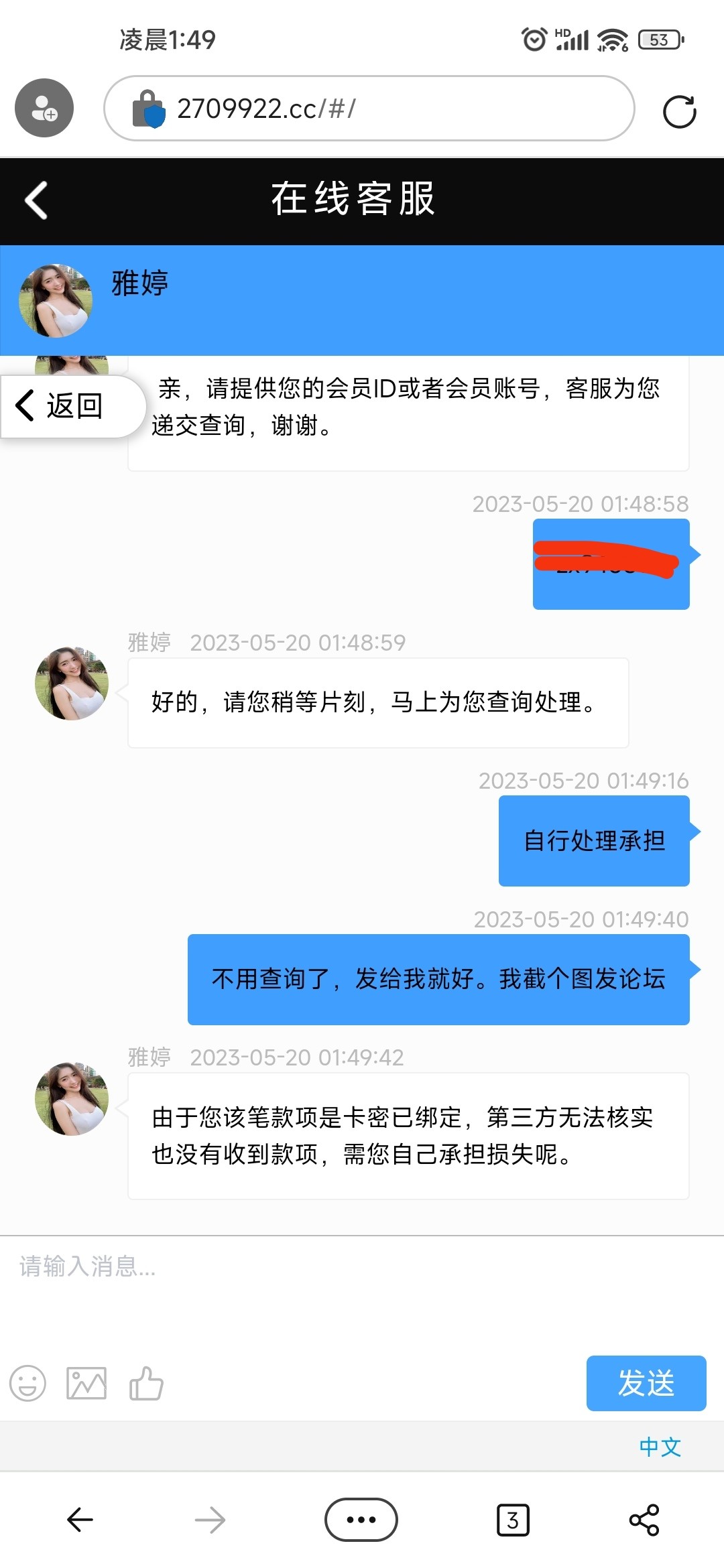 你这个270我知道开元棋牌,tmd,我现在已经联系不到他们客服了,可能被拉黑了,都进不去他们网站了,我也没想进他们网站