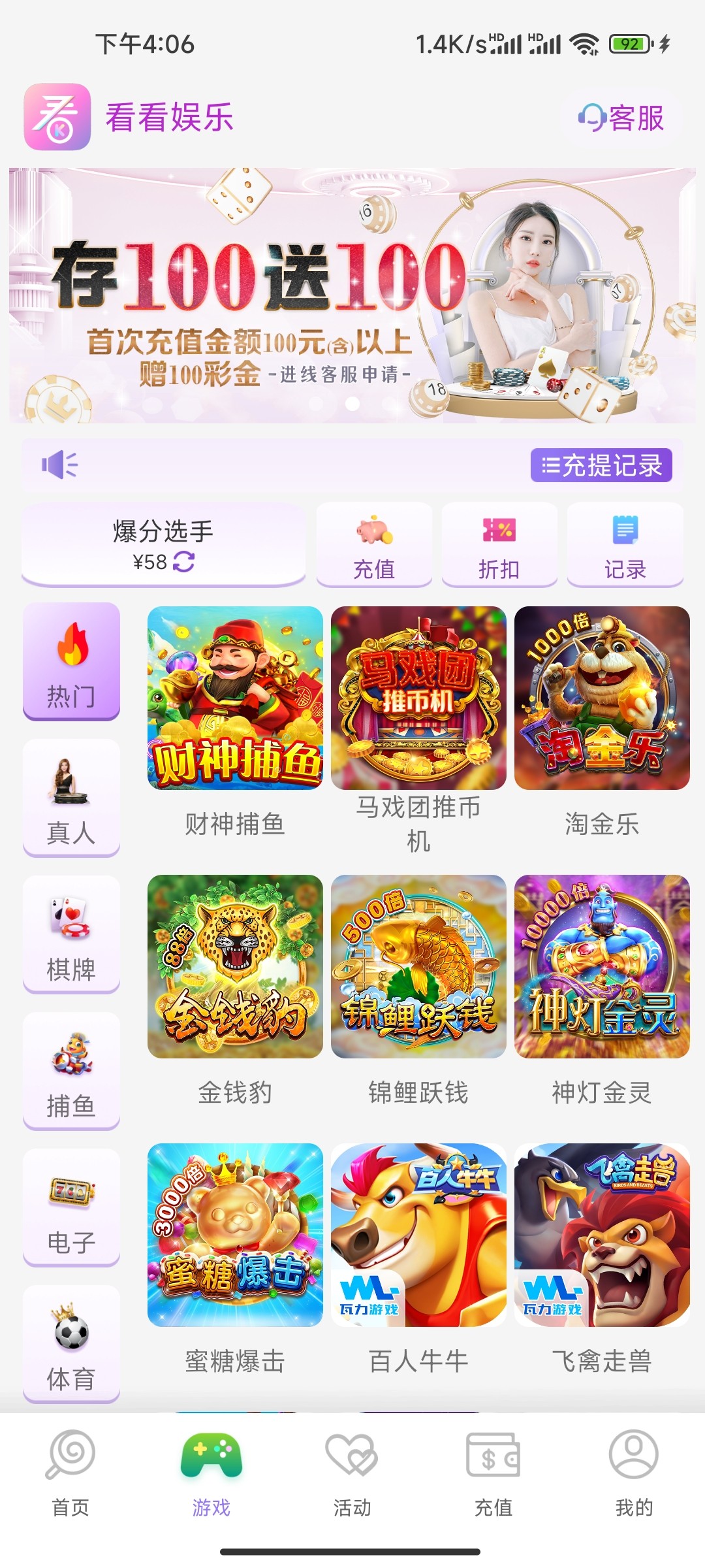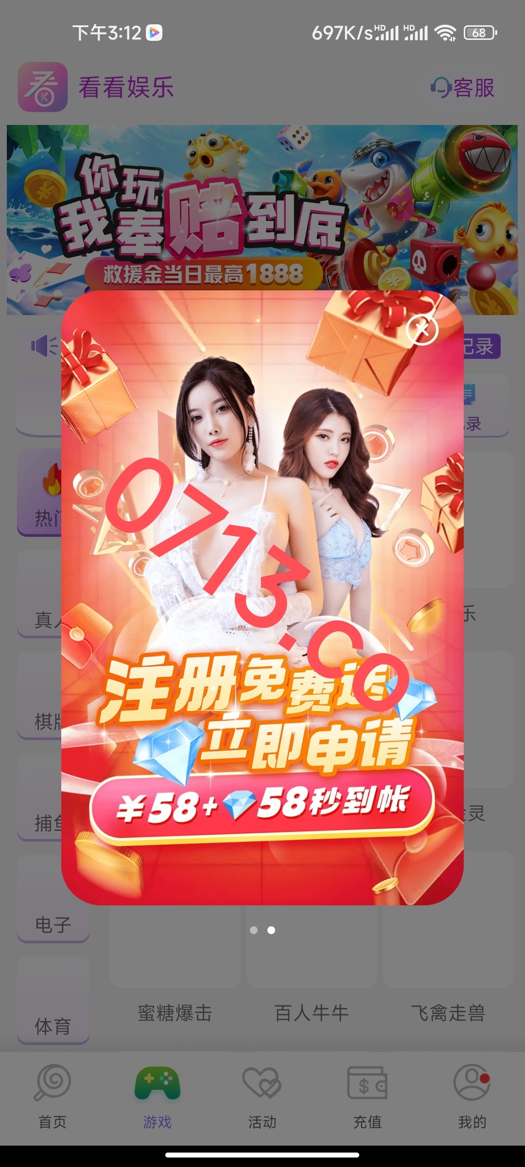看到要充值我就直接充值了100,参加了100+100,打完流水就提了,然后去申请了58,打到388了,提了,结果第一个还没到,随缘了,到了美滋滋,不到就当100没了